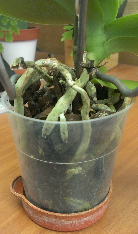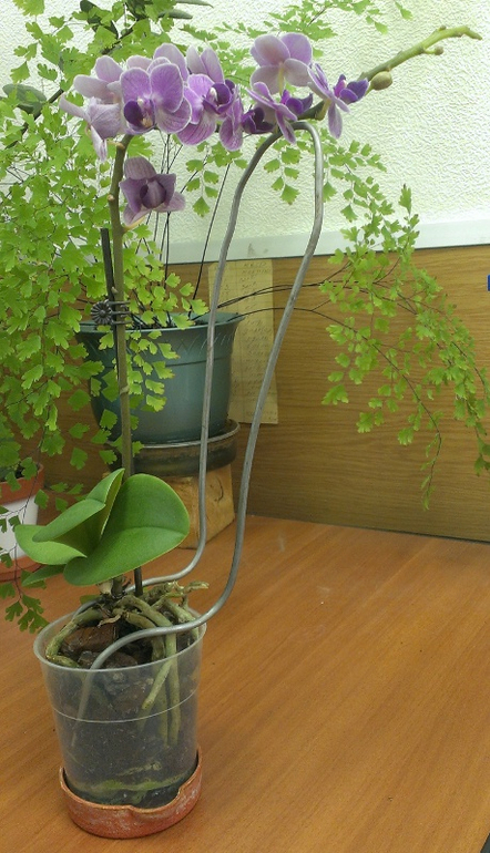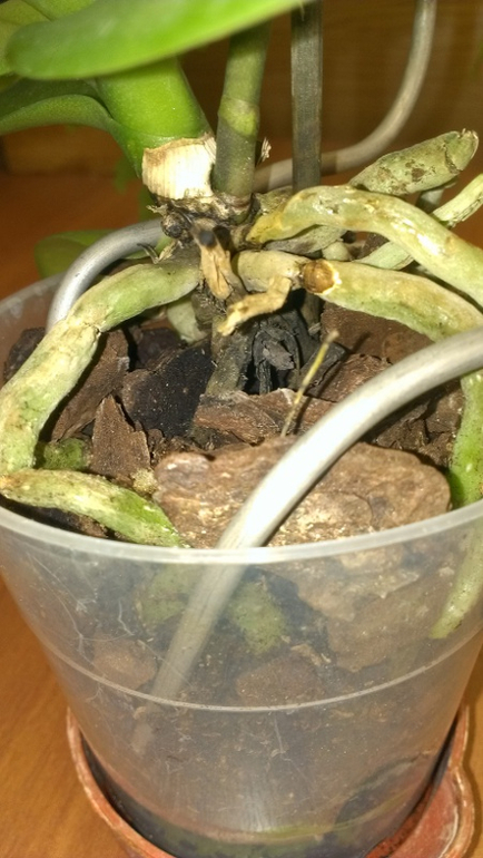 SOS! Помогите цветику!Признаюсь сразу, у меня уже было два фаленопсиса, один дома, один на работе и оба погибли, кажется я их залила. Повторения сценария категорически не хочу! поливаю в поддон по мере высыхания, т.е. смотрю, когда корни становятся серебристыми и поливаю. Но мне кажется, что это в принципе какой то неудачный экземпляр, дорогие фаленопсисоводы) подскажите, это растение нормальное или с ним что-то не так? Смущает меня чернота в центре и желтоватые неупругие листочки. Еще когда только подарили мне его (2,5 недели назад) между одним листочком и корнями была толи паутина, толи плесень белая, и на палочке-подпорке был мох-плесень белый. Спустя недельку я полила все это слааабым раствором марганцовки, вроде хуже растению не стало, даже пара бутонов распустилась, но и несколько опало. Металлическую загогулину я сама сделала, а то гнулась веточка.