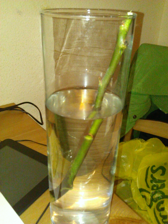 Идея фикс вырастить розу из подаренных - моя давняя мечта. Сейчас из 5-ти роз осталось всего две. Одна еще с нераспустившемся бутоном. А вот вторая та самая, с росточками/листочками. И ее я хочу вырастить, чтоб корешки пустила.