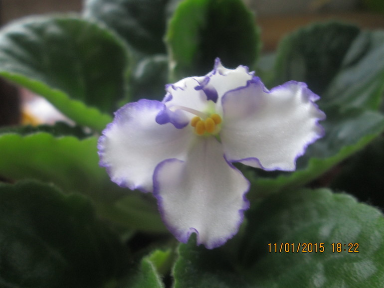Не складывались у меня отношения с фиалками. Плохо росли и не цвели. Очень они мне нравятся и всегда мечтала развести их у себя. Одна фиалочка хорошо принялась и к моему дню рождения зацвела. Но простояла с цветами всего один день. Наша маленькая разбойница оборвала ей все цветы и бутоны. И вот опять после рождества распустились цветы. Сорт не знаю. Может кто подскажет?