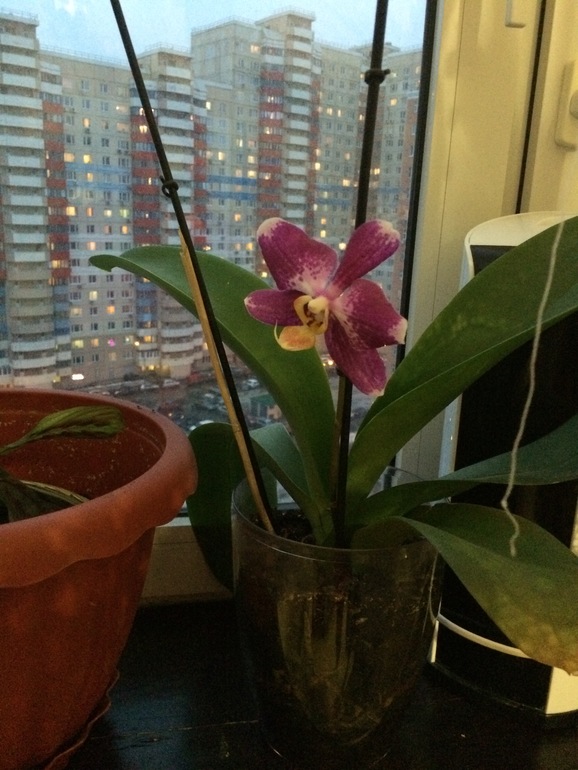Орхочка зацвела в первый раз,как подарили,осенью рассаживала,стебли хорошо давала... В бутоне долго стояла... Хоть и долго стоит,но все же смущает горшок,продавец говорила он специально для орхидей,но в нем нет дырок...совсем