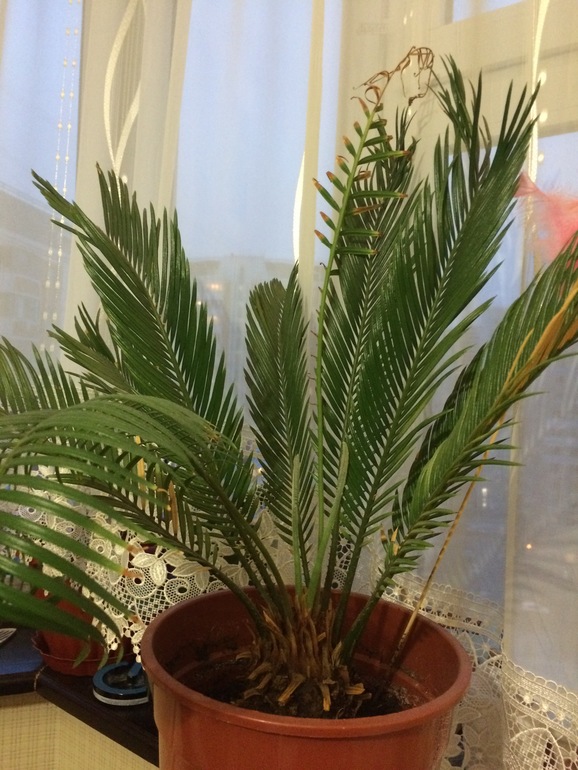 Даже и не заметила как цикас дал новые "стебли"(ростки)... Даёт ростки часто,но вот до конца они почему то "не раскрываются",видно один из прошлых ростков...Особо не ухаживаю,стоит третий год, завелась мошкара,может пересадить...?!
