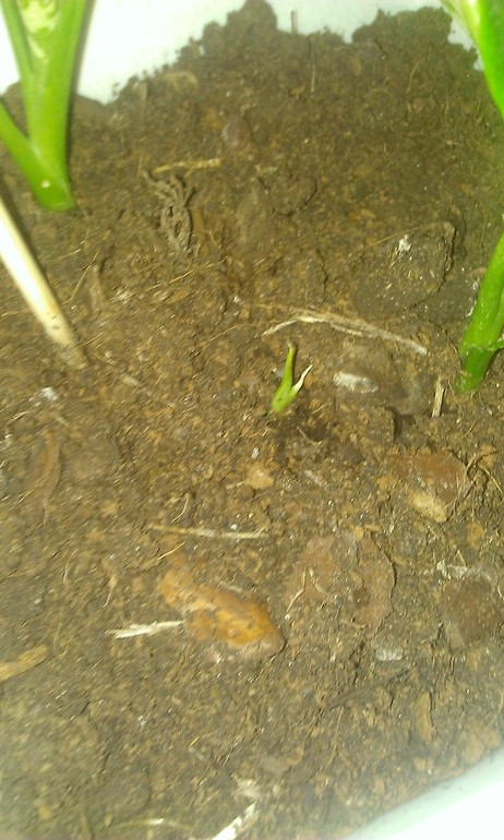 Новый росточек дифенбахии) Примечательно то, что в горшке сидит 4 куска от нее, каждый в углах. Два вот проросли уже давно, и еще два я ждала в других углах. А тут - посередине вылез. Чудеса))))