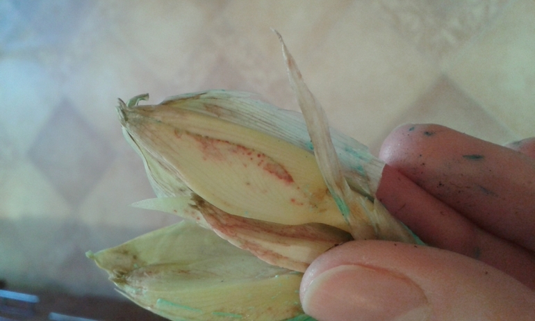 Все тщательно посрезала, замочила минут на сорок в бордосской жидкости, подсушила и зеленкой намазала. Посадила на 1/3. Сегодня вспомнила, что корневином хотела присыпать. После чистки два дня прошло. Все луковички с покраснениями. У одной листики длинные оставляла, они у основания сломались и чахнуть стали. Обрезала, а там вот что