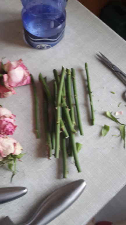 Подготовка. Розы я нарезала, оставив три почки. Верхний край ровно, а нижний под углом