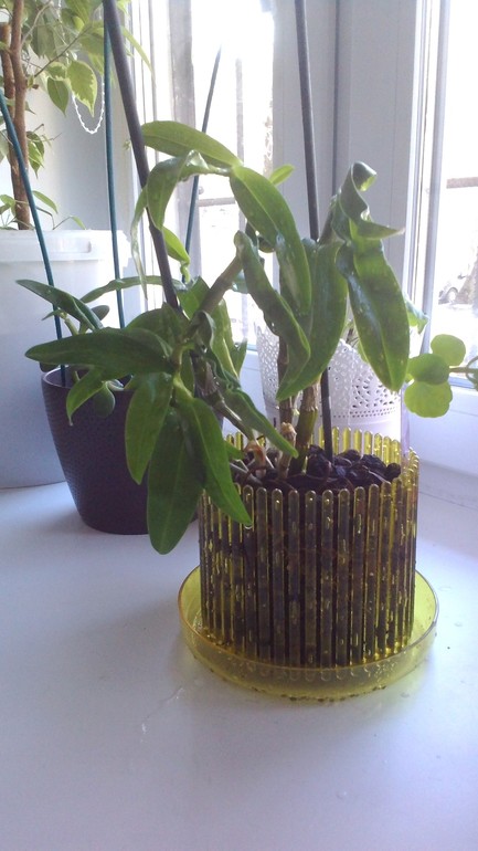 у меня она ниразу еще не цвела, так как неправильно за ней узаживала, а точнее вообще запустила, пока шел ремонт. Но вот я взялась за нее, пересадила, стараюсь создать ей комфорт. Пока она только разрослась. Сегодня увидела на двух веточках корешки(?!)