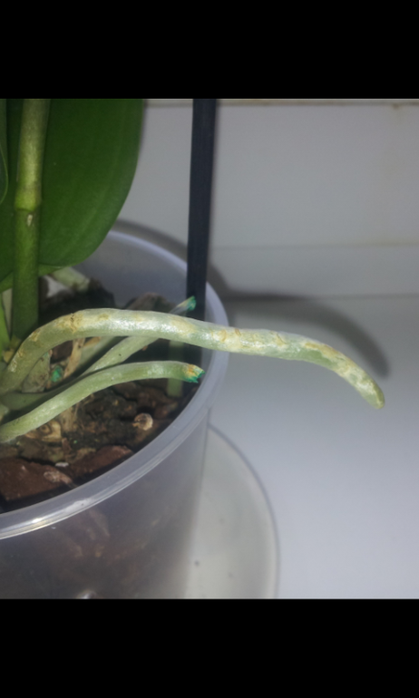 Когда купила там были сухие корни. Отрезала и помазала места среза(так начиталась в интернете). Но конкретно этот корешок не трогала он был гладкий и красивый, а сейчас как-будто трескается.