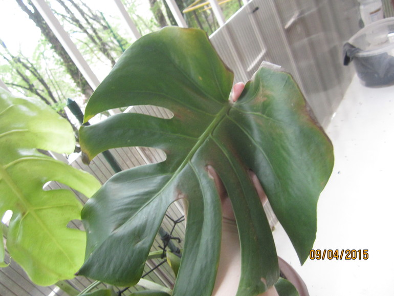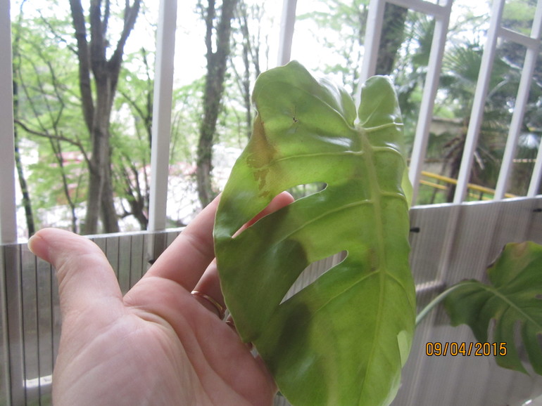 Добрый вечер! Это монстера.Попробуйте не поливать ее какое-то время (например, месяц-два) ни удобрениями, ни отваром шелухи, а просто водичкой отстоянной или фильтрованной. И не опрыскивать отваром. Листья можно протирать влажной тряпочкой.