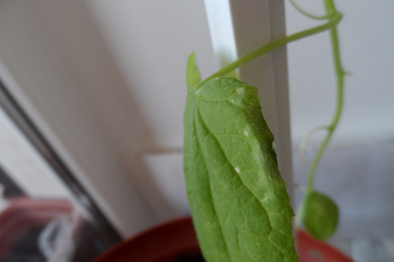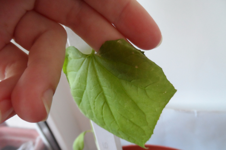 И огурец. Сеяла несколько семян. Взошли всего 2, один из которых пропал. В общем, вроде растет пока, но что-то странное с ним происходит. Листья периодически вот так увядают. Хотя вроде и не заливаю водой и не пересушиваю. Несколько листьев нижних завяли конкретно, я их оторвала. На фото видно, что на листочках появляются какие-то прозрачные пятнышки, а сам листик с краев начинает вянуть. Потом полностью увядает весь лист. И так по-очереди снизу вверх.... Что это? И что делать с огурцом?