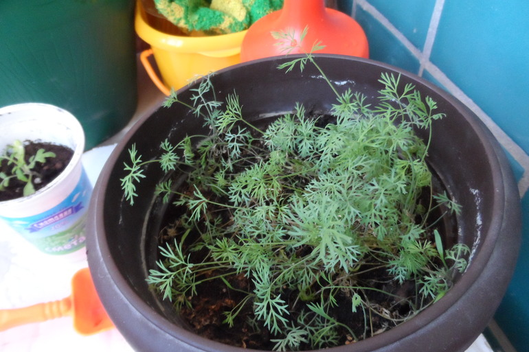 Укропчик. Ох, я думала, что уже не видать нам его... Посеяла еще в середине февраля. А солнца-то нет почти. Он бедьненький, еле выжил. Половина всходов завяла. Остальное ,что осталось, под лампой днями держала. Сидел укроп долго на одном месте. А сейчас вынесла на балкон, там светлее, да и дни солнечные прибавились. И наконец-то травка в рост пошла :)