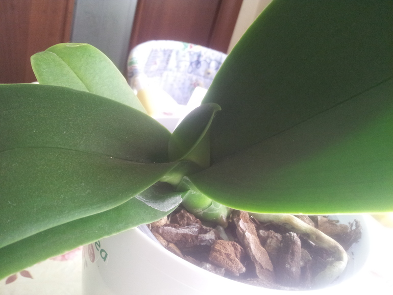 выпустила один новый листочек, пару недель назад, уже подрос))))Подскажите, пожалуйста, а то я с орхидеями раньше дела не имела))))