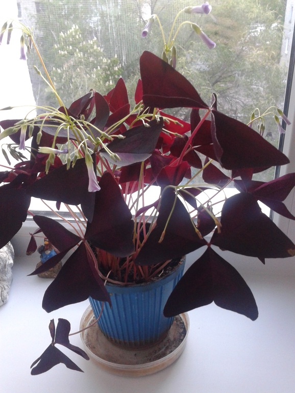 Второй оксалис или "ночная бабочка".Неприхотливый домашний цветочек.Оригинальный.На ночь складывает листочки.Цветет сиреневыми колокольчиками.