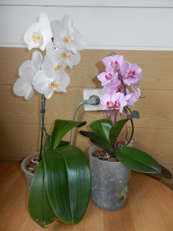 Как я их заставила цвести ??? В феврале я из "спрятала" (поставила) на пару недель в шкаф купе в своей спальне на пол, там не душно и часто открываем проветривать дверь на лоджию . Соответственно не поливая. Через две недели вернула их на место, полила удобрением, а в марте начали обильно появляться новые корни, а вслед за ними и новые стрелки выпустили. Вот они мои красотки. Белая с крупными цветами, а сиреневая полосатая помельче, но пушистие.