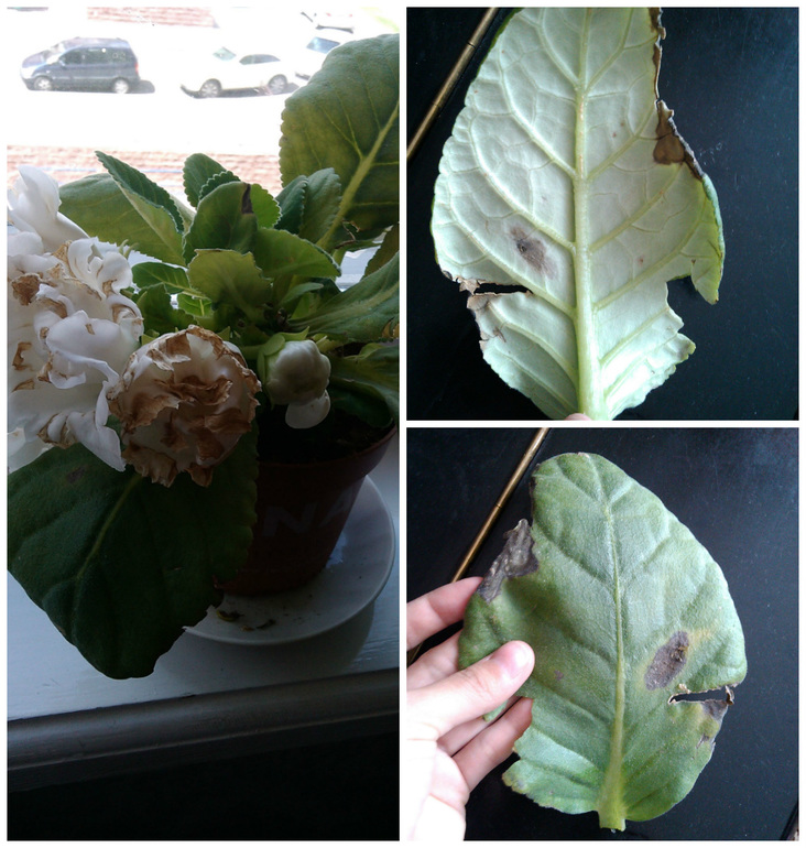 SOS! Помогите цветику!Эксперты глоксиний,подскажите чем помочь растению.... Чернеют листья и бутоны,точнее коричневеют,по краю засушиваются.... Почему? где лучше держать горшок? может это ожоги или вдруг заражение или насекомое? Я срезала этот старые большой чернеющий лист. Но и на новых листьях как видите на фото тоже есть почернения.... Надо ли пересадить цветок в бОльший горшок? когда и чем удобрять? надо ли.... Спасибо,очень полагаюсь на вас,это единственное и первое мое комнатное растение.... Держу на подоконнике,когда солнце на другой стороне (но пару дней забывала убирать и солнце палило на цветок), а когда светит прямо в это окно,убираю цветок в тень... Поливаю в поддон, не опрыскиваю, что еще нужно и не нужно делать? А еще заметила у всех на фото у глоксиний такие мягенькие бархатистые листья,а у моей вот большие листья жесткие, не сгинающиеся,а то надламываются.... Это такой сорт или что?