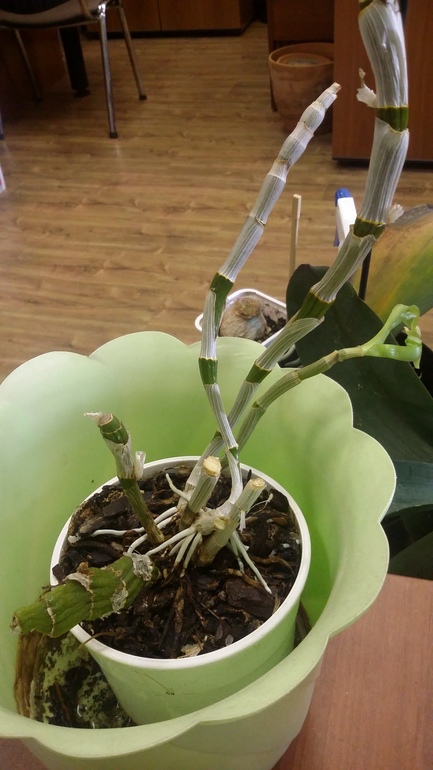 а дендробиум через 5 дней после переселения в нашу комнату сбросил листья и стволик сожмухрился.