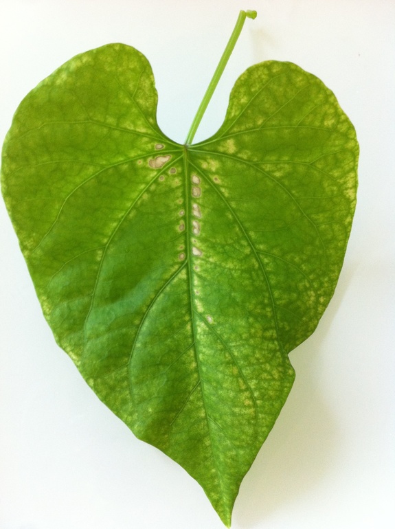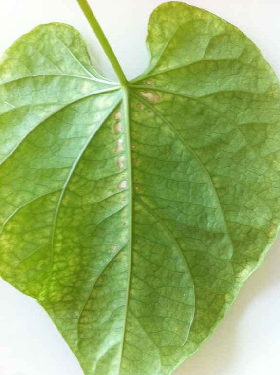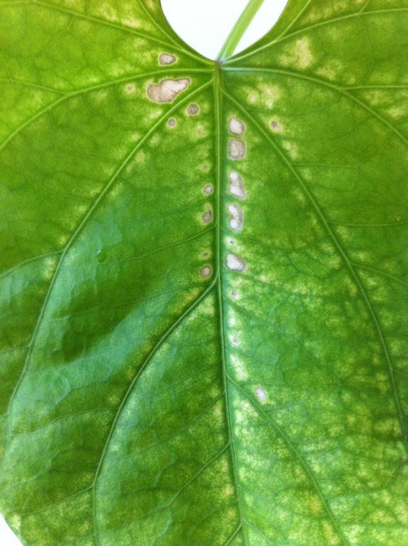 Посадила ипомею на балкон, вроде хорошо растет, но стали появляться вот такие пятна на листьях. При осмотре паразитов не видно. Помогите, пожалуйста, опознать что это?