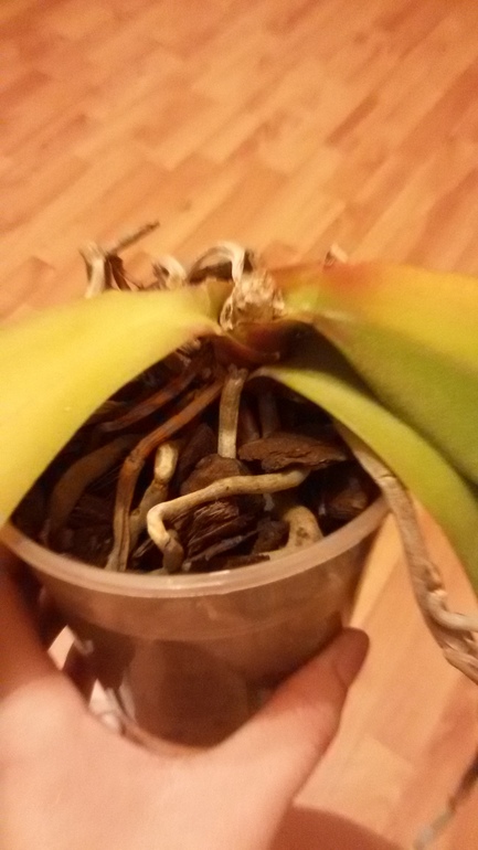 Достать из горшка, удалить все гнилые и пустые корни, если есть живые корешки то можно спасти. Обрезать листья и посадить в новую кору, вымоченную, потом месяц не поливать, если есть цитокинитовая паста, поцарапать ствол и помазать пастой. Все срезы на корнях, листьях, посыпте углем активированным или корицей. Если будут вопросы пишите в личку.