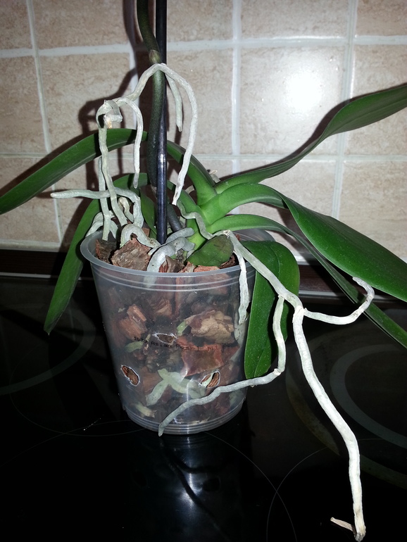 Состоянее вроде хорошее. Корешки все живые,обрезать ничего не пришлось. Только кору поменяла(вытряхнула паролон и труху всякую) и дырок наделала. Вот только воздушных корней много. Можно ее пока в этом горшке оставить или нужно в побольше пересадить?