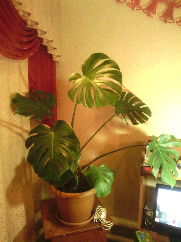 3) Монстера. Хотела избавиться от нее недавно, в школу у тащить, так муж не дал, говорит оставь в покое мою пальму, она стоит возле его компа, он стих даже придумал: я под пальмою сижу и картиночки гляжу))))