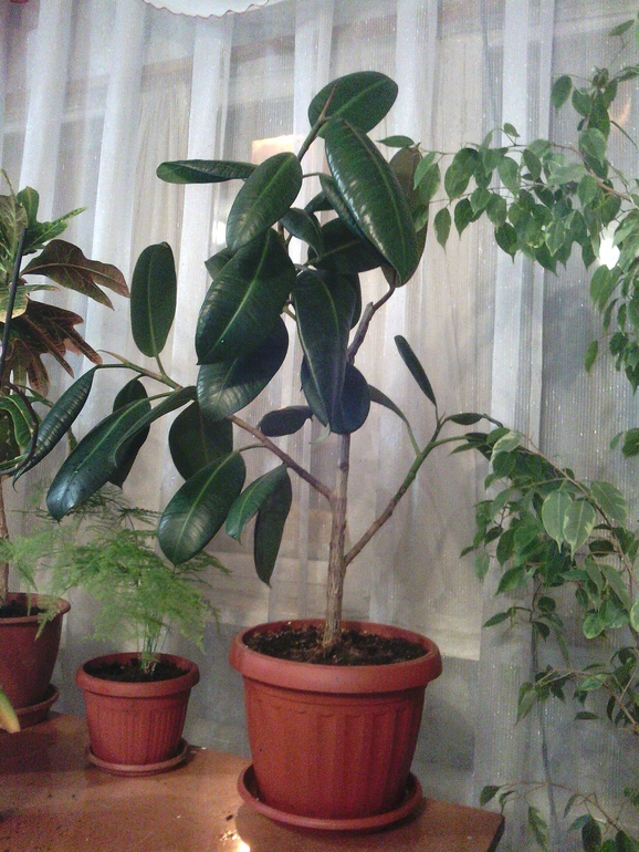 3) Фикус эластика, у меня их два, но этот старше и красивее. Второго видно на предыдущей фотке, я его, можно сказать, спасла))) Он жил у свекрови, летом на улице, во дворе (частный дом), надоел он ей, сказала, что не хочет его на зиму забирать, ну я и забрала))))) А он листики новые тут же выпустил)))