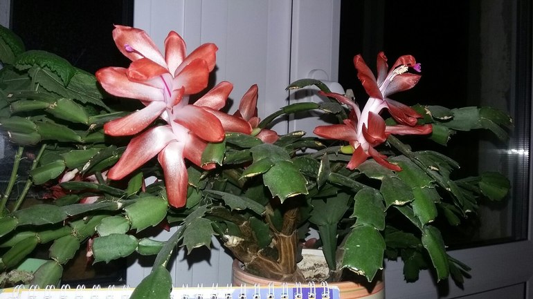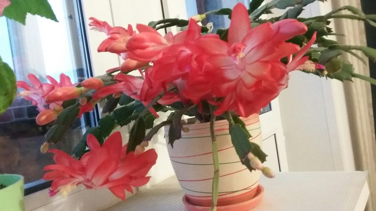 В Красногорске у меняне цвели(. А тут окно прохладное-щелка небольшая и ему как раз. В теплом не будет цвести. Ему перепады температур нужны между летом и зимой. А так растет как трава)). Еще бывают красные, розовые и белые. Я о белом мечтаю, но ставить некуда((. А у меня лососевый цвет