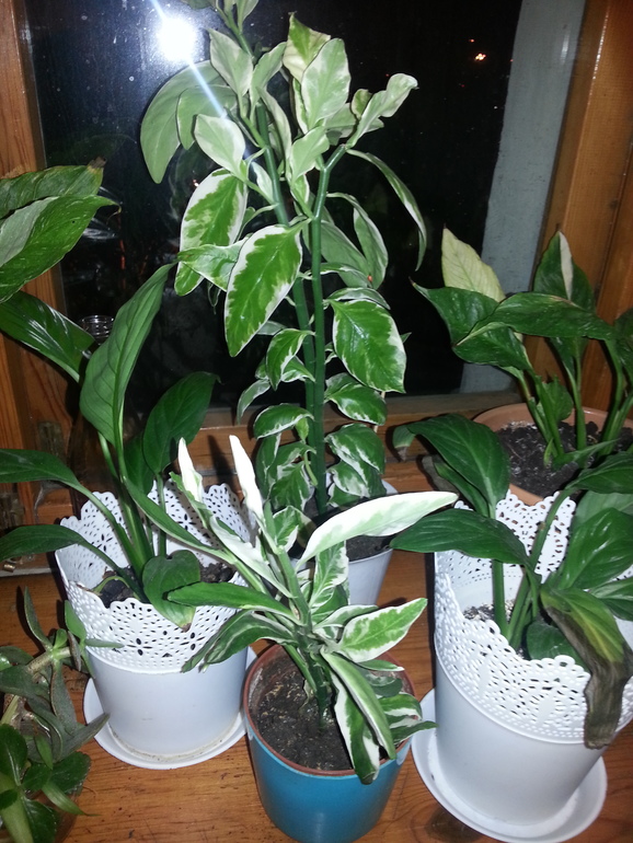 на третьем фото по центру высокий педилантус, вокруг него спацифилиум или спатифилиум (кто как говорит). Рядом с ними с краю денежное дерево - крассула, а вот в самом центре на первом ряду отсвечивает, не пойму, тоже видимо педилантус