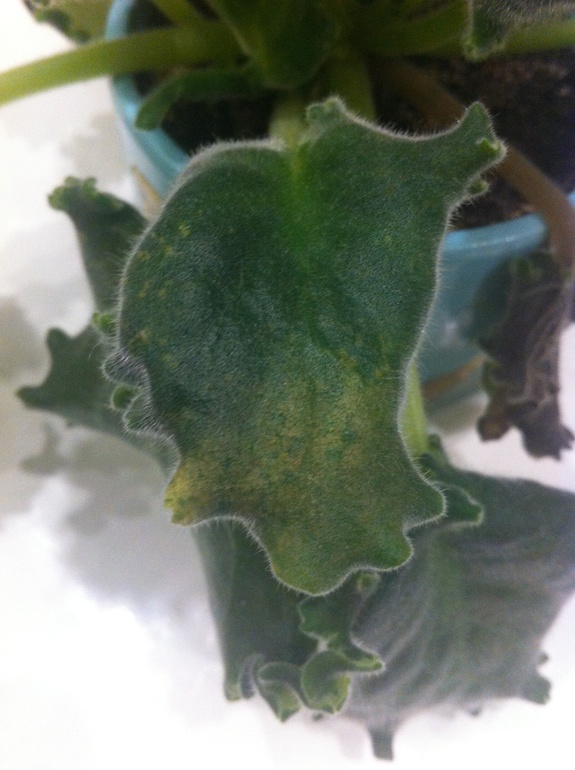 SOS! Помогите цветику!Неделю назад заметила, что некоторые листья начали светлеть, а потом и вянуть и отмирать. Каких либо ползающих паразитов не вижу. Помогите опознать, чем болеет фиалка.