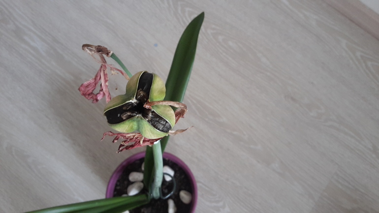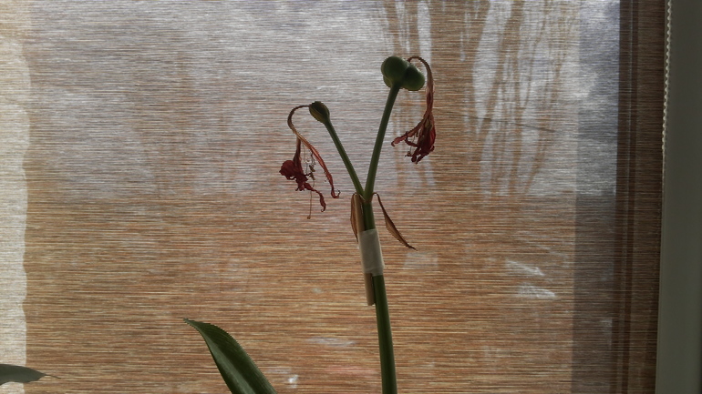 Взяла кусок китайской палочки и перемотала пластырем. Было обидно, но все к лучшему ибо гиппеаструм, как я позже узнала, тратит очень много сил на выгонку семян. Выглядело это так: