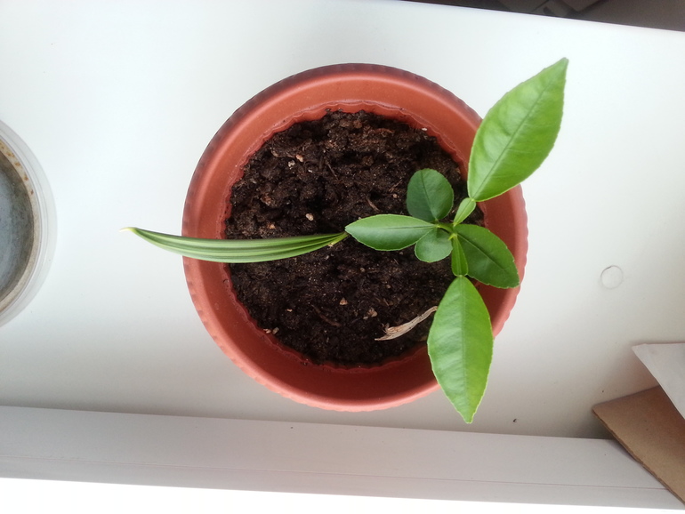 Имеелся горшок. В него посадили 4 косточки. Как я поняла - мандарин, апельсин, лимон и еще что-то)))