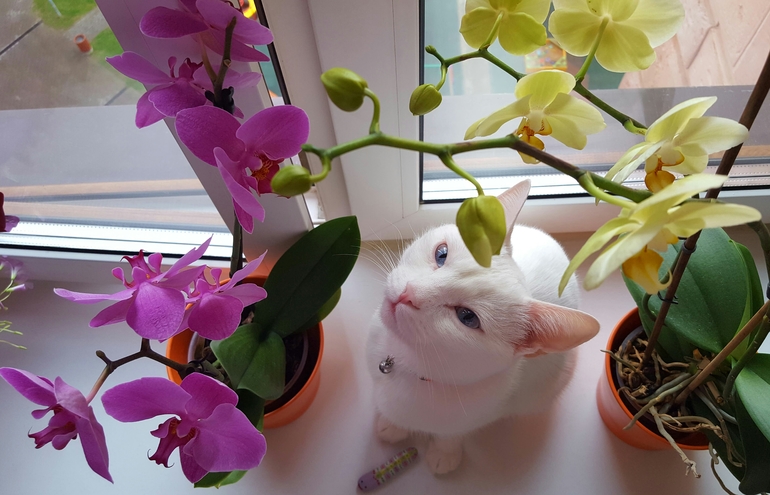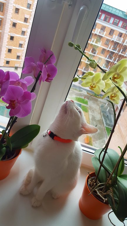 ОрхидеиПокажу вам свою лимонную орхидею. Конечно не обошлось без моего супермодели Зайца. Стоят пока на окне на кухне, но в скором времени куплю стойку для цветов и уберу в глубь кухни, тк уже пару раз солнце их опалило.