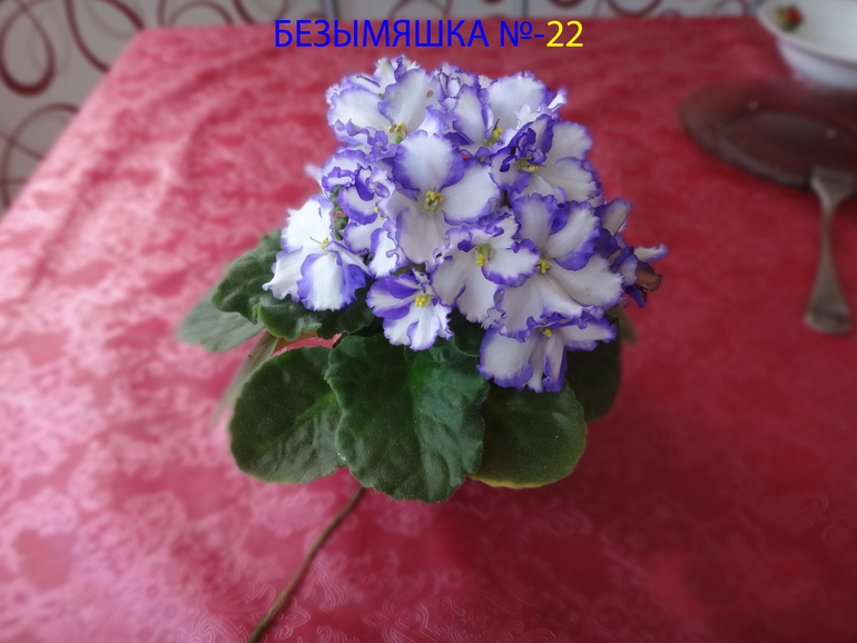 могу предложить уже растущую фиалочку молодую похожую на вашу безымяшку, но не с такой пышной шапкой, но с очень похожими цветочками только бело-розовыми. Хотя может у вас она будет цвести более "шапочно"))