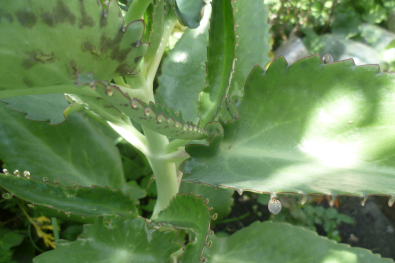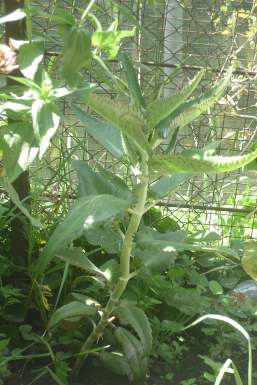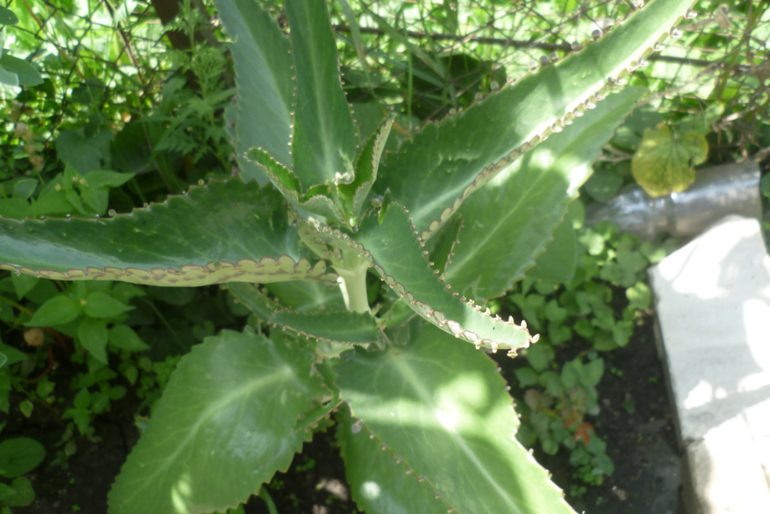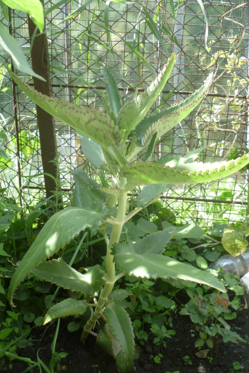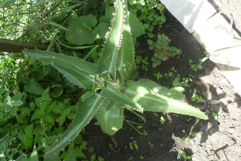 Каланхоэ! Лечебный. Рос дома в горшке. Вытянулся тонкий и хилый совсем был. Верхушку срезала, поставила в воду. Выбрасывать было жалко. Решила посадить в клумбе. Эксперимент удался!