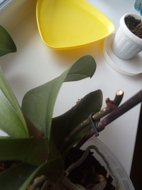 Орхидеидевочки, помогите определить, что это цветонос или детка? Уже долго наблюдаю, у нескольких орхидей цветоносы довольно таки быстро расту и сомнений в том, что это цветонос, а этот прямо как будто замер....