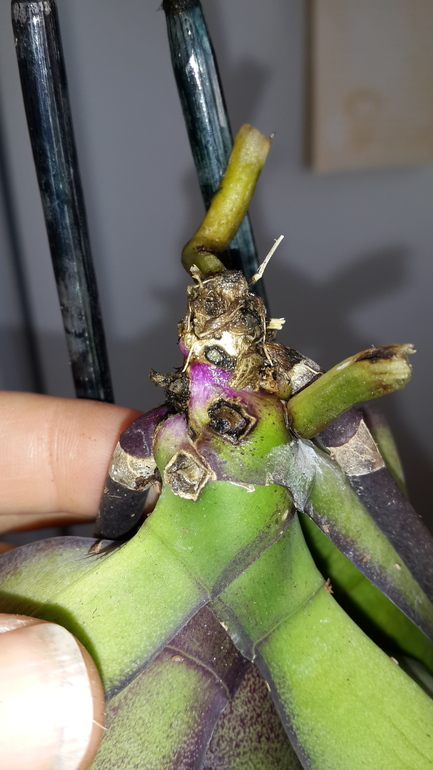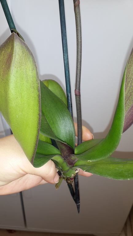 листья еще крепкие, есть два цветоноса. один еще с цветами ( 2 ). Корней нет вообще, 2 малюсеньких обрубка осталось (