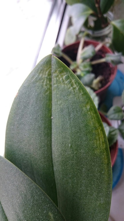 Мне тоже кажется что это клещ, обработать нужно на всякий случай. Я недавно новую орхидею принесла с уценки и не обратила внимание на листья уже дома увидела паутинный клещ. Обработала зеленым мылом три раза и чувствует орхидея себя прекрасно, листик новый ростит))