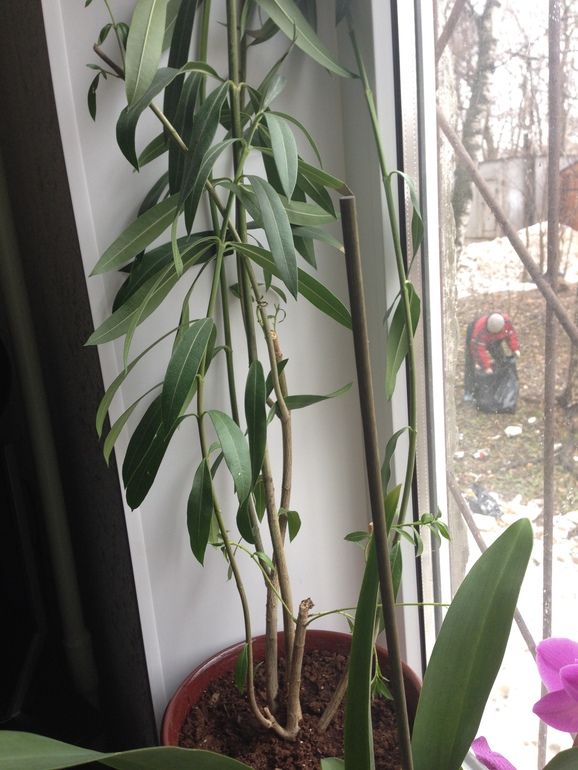 Олеандр. Растение ядовитое поэтому кушать его не надо и после обрезки руки тоже лучше сначала вымыть. Обрезать его надо, в противном случае так и будет расти длинными хлыстами. Ну и окно ему надо южное, без солнца будет заморышем.