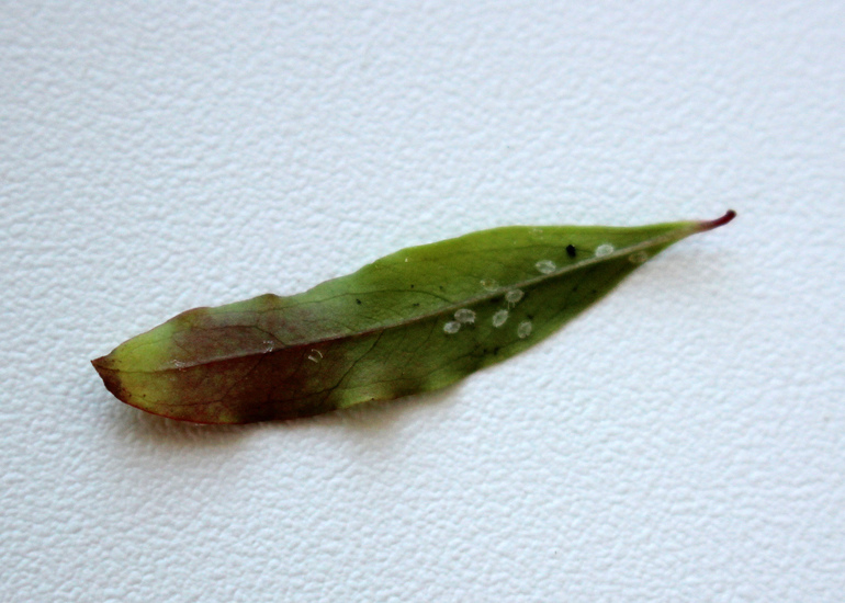 Это маленький листик граната! У меня два молоденьких граната, недавно один стал терять листики, я опрыскала фитовермом, подкормила витаминками. Сегодня поливаю, осматриваю их, поднимаю листочек, а тааааам!!!(((( Ужас какой-то!!!