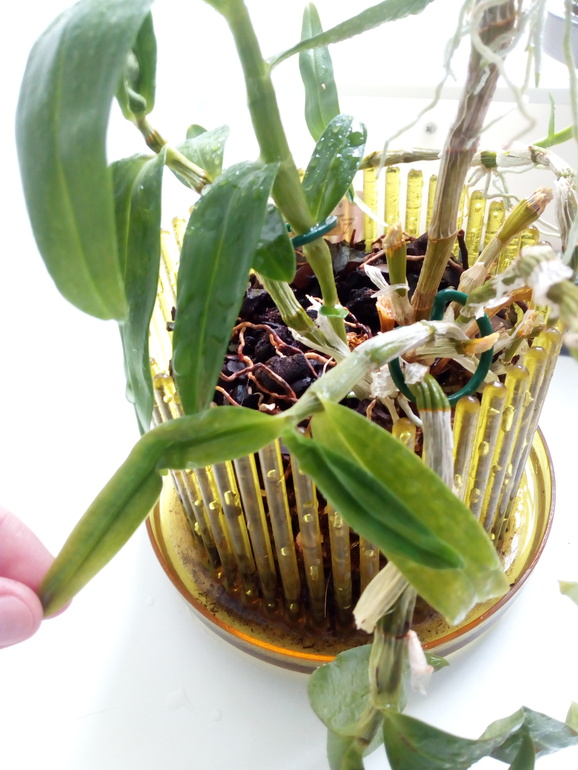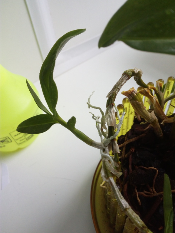 ОрхидеиЕсть у меня несчастная женщина. Моя дендробиум нобиле. Так уж случилось, что она появилась у меня в нелегкий период- двухгодовой ремонт сменяемый рождением сына, когда времени не было в туалет сходить, а не то что создавать климат "капризной девице". Короче, попала она ко мне красоткой 50 см, вся покрытая нежнейшими белыми цветочками. Благополучно сбросив цвет, она укоротилась до "пенька", так гласили форумы по уходу за "леди". И все. Три года она просто давала невысокие стволики, которые мучились от жары и сухости зимой, окутывались облаками строительной пыли и тд. Короче, не цвела и толком не росла. Наконец, я занялась ее судьбой и девочка ответила благодарностью в виде цветения в августе(да, как то совсем не по книжному у нас сложилось). Так же два года она обрастает детками. Вот это на старом стволе