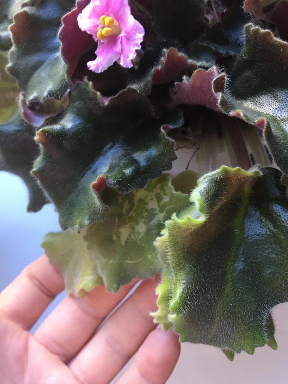 4. Вот у этой листья стали темнее и крепче, но все растут вверх. Зацвела на прошлой неделе впервые. Знаю, что так бывает, когда солнца много или холодно, но она стоит м другими на темном подоконнике (солнца мало и во второй половине дня)