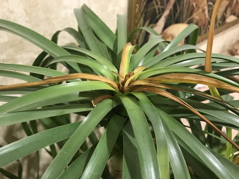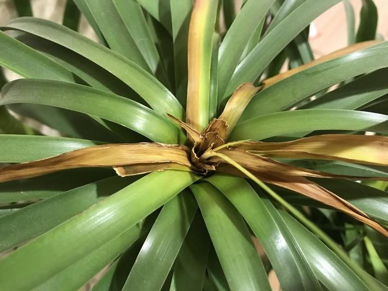 Есть взрослая нолина, поливаем 1 раз в неделю-10 дней, до полного просыхания почвы. Весь летний период стояла на лоджии, сейчас переехала в комнату, на зимовку, где по сравнению с лоджией темнее. И сердцевина растения, откуда растут новые листочки, стала коричневеть, то есть погибли молоденькие листочки. С чем это связано и как помочь?