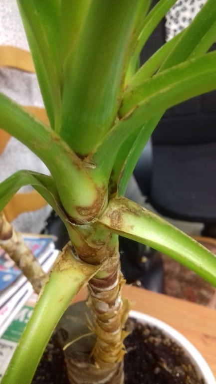Болезни комнатных растенийДевочки,на работе заболела Юкка.У основания листь ев да и на самих листьях коричневые пятна.Как лечить?