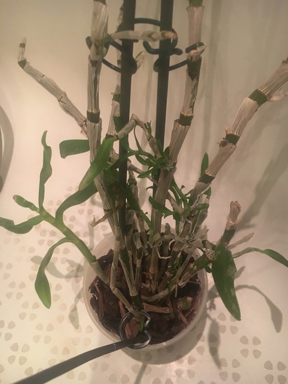 Если вы в кору посадили, то моему не очень понравилась она, лучше что-то типо смеси земли, торфа и очень мелкой коры. Те что палки без листьев бесполезны, я их обрезала, если на них месяц или 2 новых отростков не появлялось! А ещё, вы уверены что там одно растение, такое густое!?