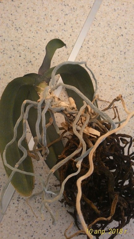 Намочите, все верхние корни живы и они будут зелёными или серебряными. Вот эти самые корни оставляем, остальные срезаем, присылаем корицей, прослушиваем и в кору. Листья трогать не надо, она если нужно их сама засушит.