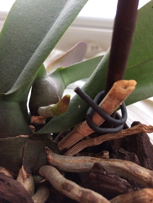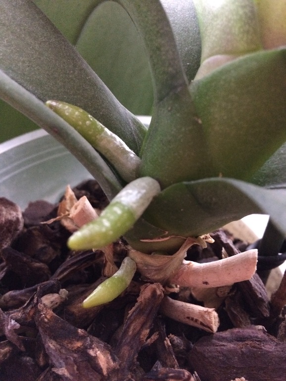 Цветоносы темно-зеленые, корни серебрятся. На фото справа цветонос, слева - корень