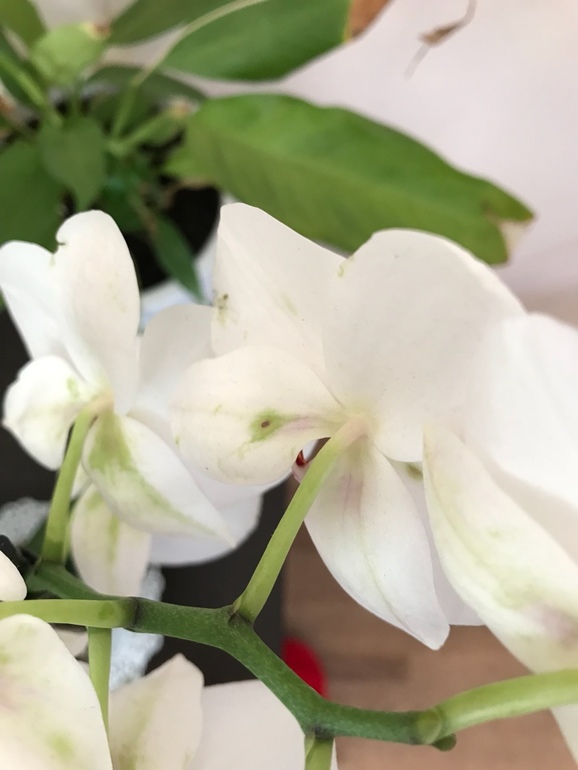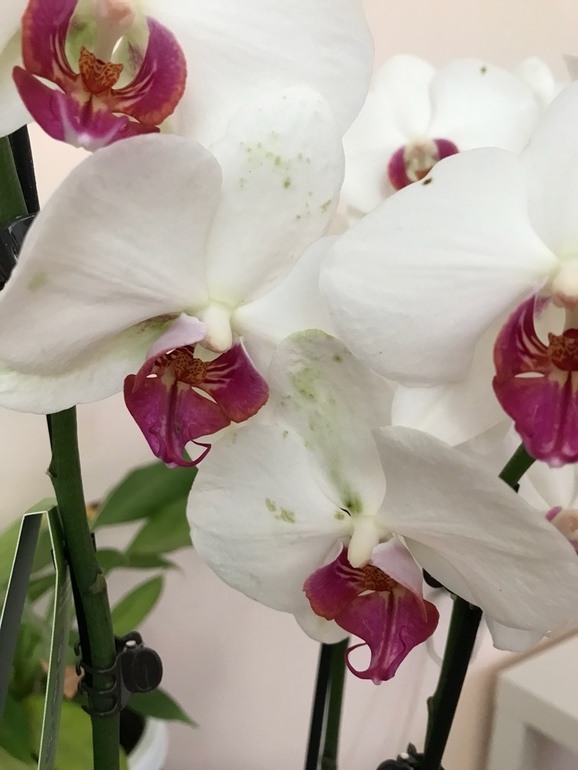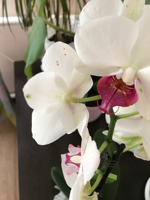 Болезни комнатных растенийДевочки, это моя первая орхидея. Недавно увидела на цветах точечки, местами темные, местами зеленые. В чем причина их появления? Что это может быть?