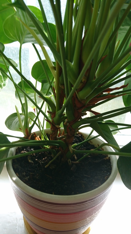 Девочки, помогите с цветком. Разросся сильно. Обильно цветёт. Уже падает без поддержки. Как его пересадить сейчас? На сколько заглублять? И вообще эти корни воздушные можно в землю?