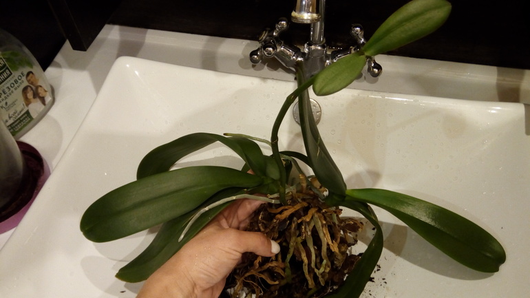 Промыть чисто от всего, можно прямо под душем. Отрезать сухие гнилые корни чистым ножом/лезвием. Купить кору для орхидей, не грунт, а чистую без добавок кору, горшок с дврками. Поливать замачиванием/проливанием сквозь горшок. Детку пока я бы не трогала, корешков личных не вижу. Отличный цветок. Посадите и ждите цветения. У меня 9 орхидей и ни одной деточки не было никогда, только цветут без остановки.