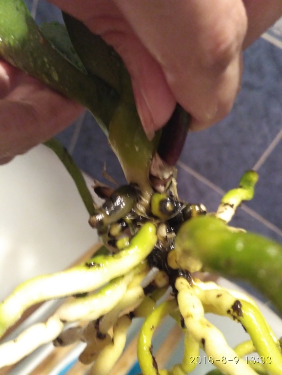 Не совсем понятно что с шейкой. Я бы обработала черные места фундазолом, вообще искупала бы ее в фундазоле, на темные намазала кашицей. Просушить вверх ногами сутки. Далее в новый грунт (кору). От мошек можно фитовермом, если активно полезут снова, если не будет, то профилактику - прлливать слабым раствором марганца иногда.