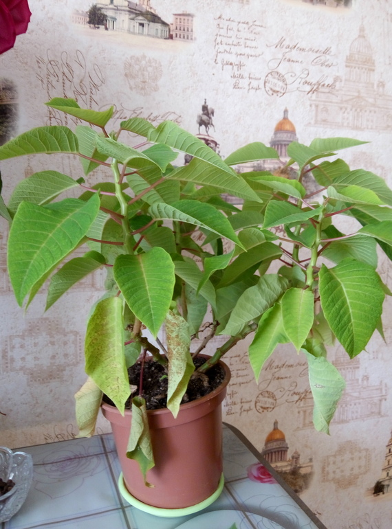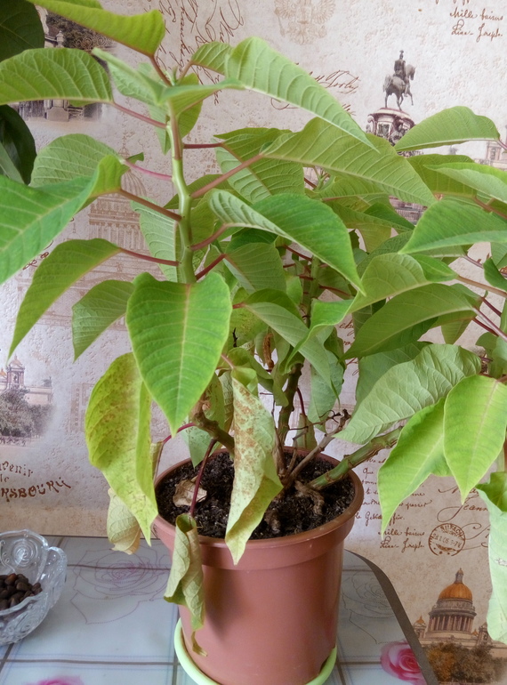 и все было хорошо, пока не начали желтеть листья. Сначала покрываются желтовато-коричневатой КоАП нкой, а потом высыхают и опадают. Девочки, подскажите, что это? У нас сейчас жара, может быть из-за жары? И вопрос, чем подкармливать пуансеттию и в какой период?