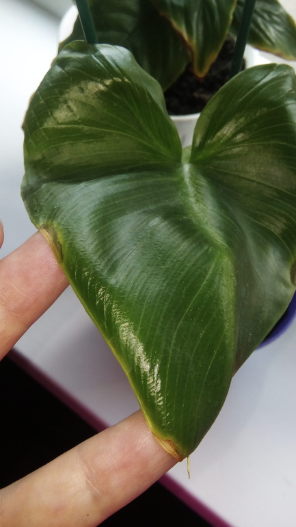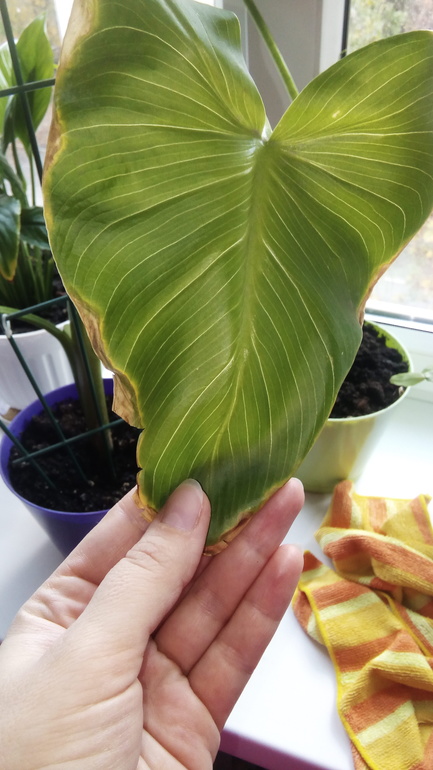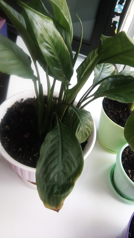 У спатифиллума тоже большой горшок. Выберите горшок строго по размеру корневой, прям тесный. Тогда цвести начнет и лист не будет портить от перелива (в большом объеме грунт просыхать не успевает, корневая угнетается и лист портится). Не связывайте это с сухим воздухом.