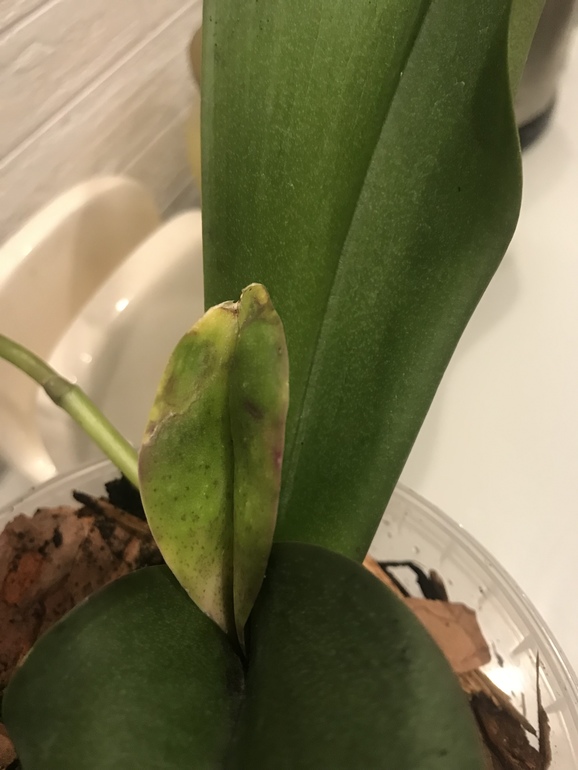 Модераторская (сюда пишут только модераторы)Помогите начинающему: у основания листьев какой-то налёт, липкие капли. Новый листик растёт жёлтым и явно не здоров. Хотя растение дало новый цветонос
